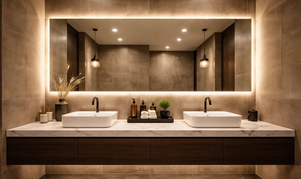 У санвузлах з двома і більше умивальниками велике прямокутне дзеркало виконує одразу кілька функцій: практичну, навігаційну та естетичну. Воно допомагає організувати простір, візуально розширює приміщення та забезпечує зручність одночасного користування для кількох людей. Саме тому правильний вибір формату дзеркала має велике значення.
