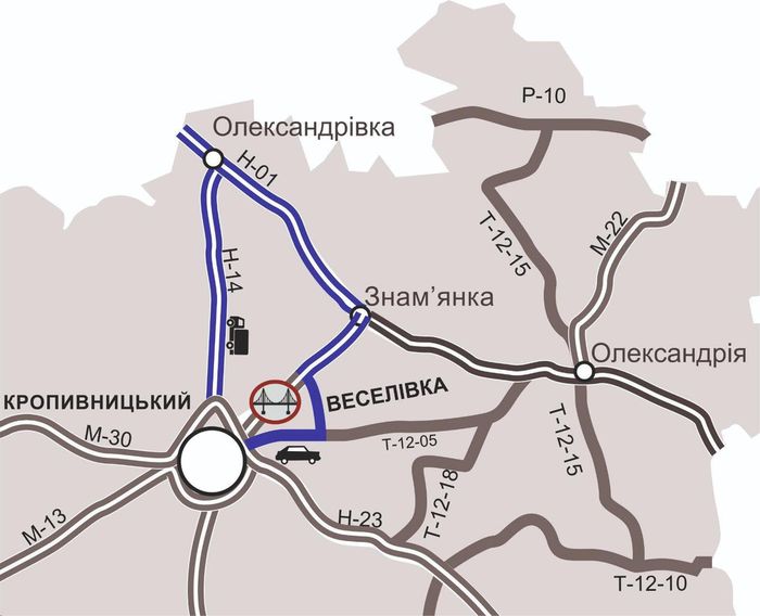 У зв’язку з проведенням ремонтних робіт на км 734 + 610 автодороги М-30 Стрий — Умань — Дніпро — Ізварине (ділянка між м. Кропивницький та м. Знам’янка) з 09:00 8 листопада до 30 листопада рух транспорту буде повністю тимчасово перекритий.